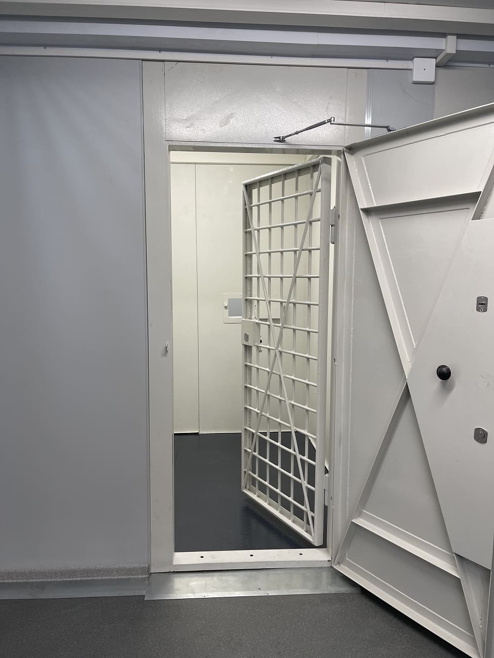 Очередной нестандартный проект. Отделка фасада металлическими кассетами собственного производства, внутренние стены усилены металлическим листом и решеткой, отделка стен панелями гипсоакрил и плиткой, отделка потолка СМЛ панелями. Здание оборудовано автоматическими усиленными рольставнями (4 класс). Часть помещений имеют бронированные окна и двери.