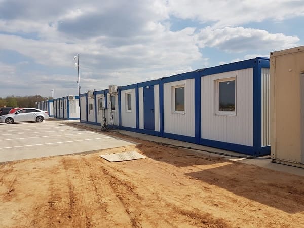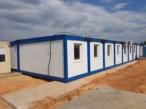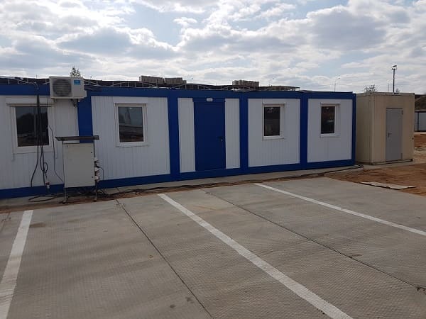 Модульное здание штаба строительства на базе блок-контейнеров "Универсал", имеющие односкатную кровельную раму по типу, ранее выпускаемому "КССК МО".