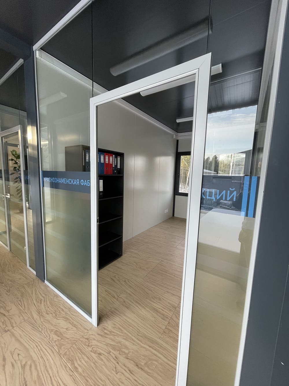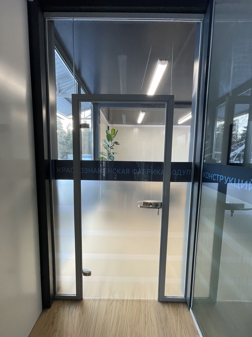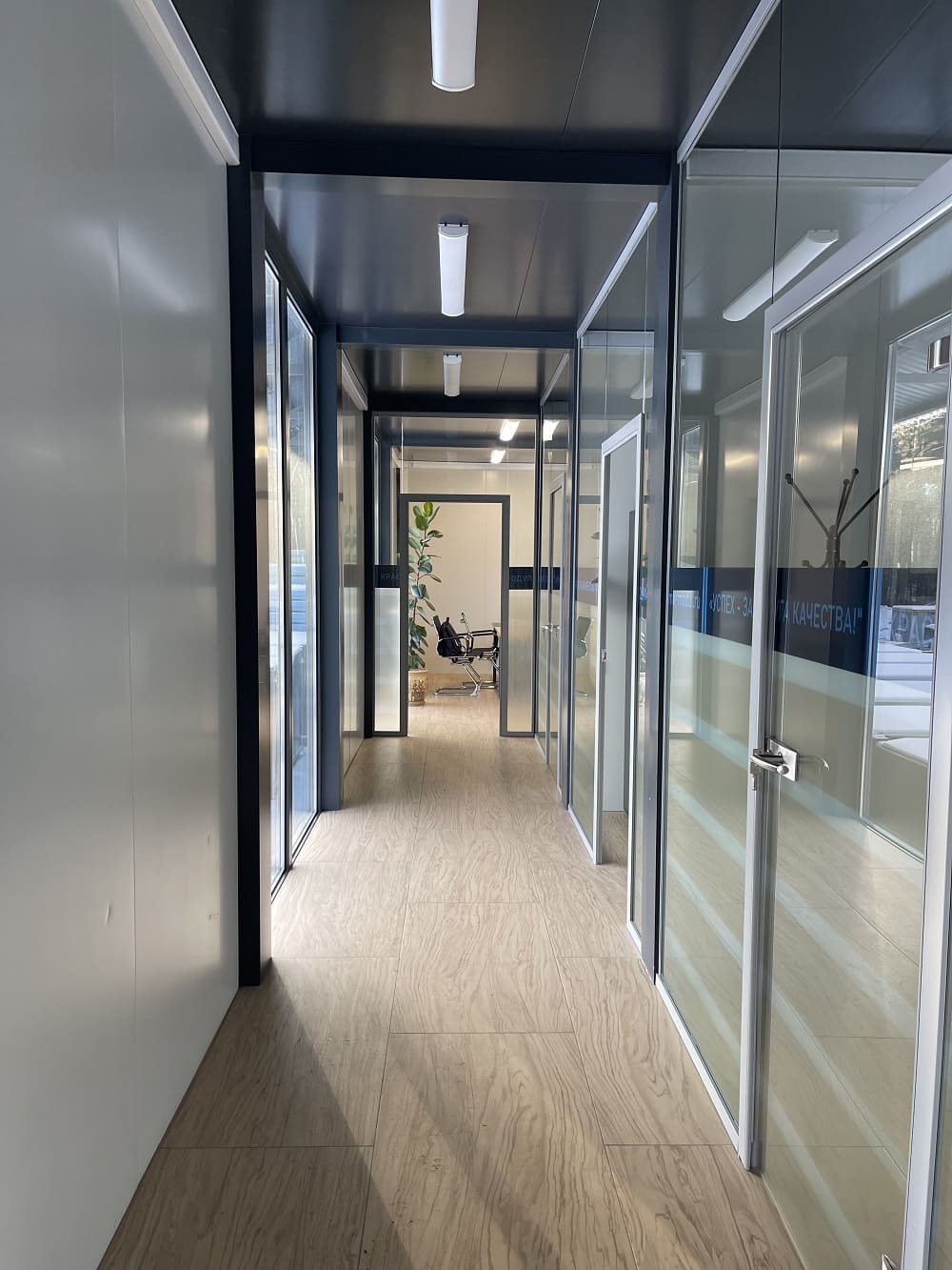 В итоге: потолки 3 м, отделка потолков - сэндвич панель; перегородки и внутренние двери из стекла; теплый пол во всех помещениях; витражное остекление без горизонтальных импостов.