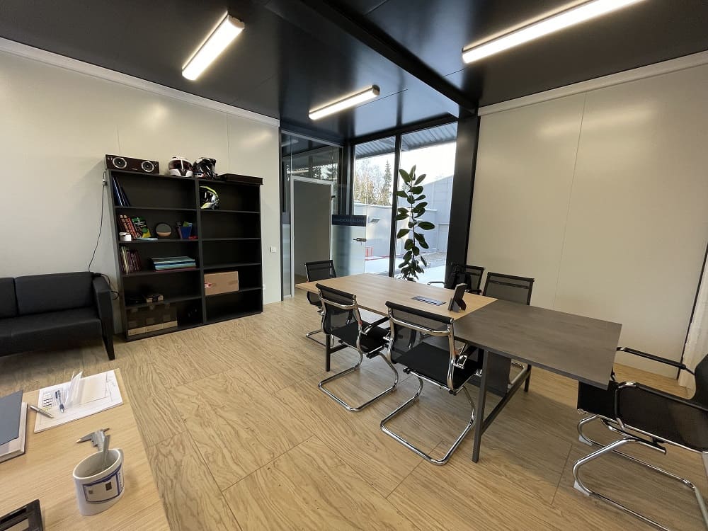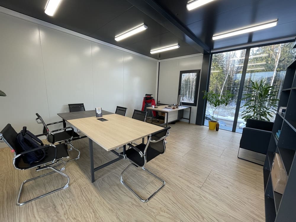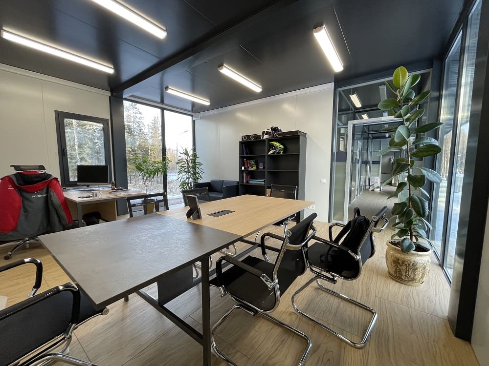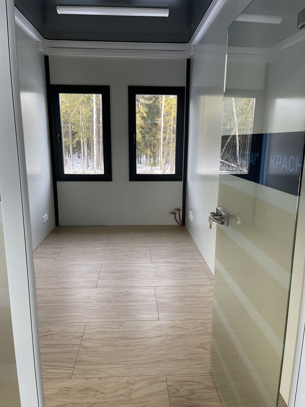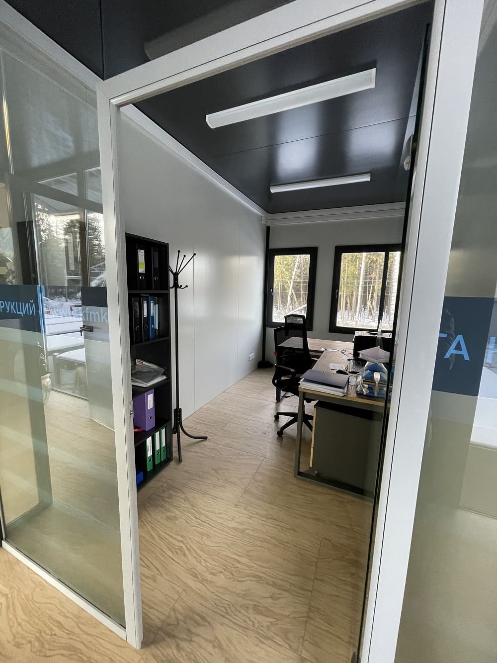 В итоге: потолки 3 м, отделка потолков - сэндвич панель; перегородки и внутренние двери из стекла; теплый пол во всех помещениях; витражное остекление без горизонтальных импостов.